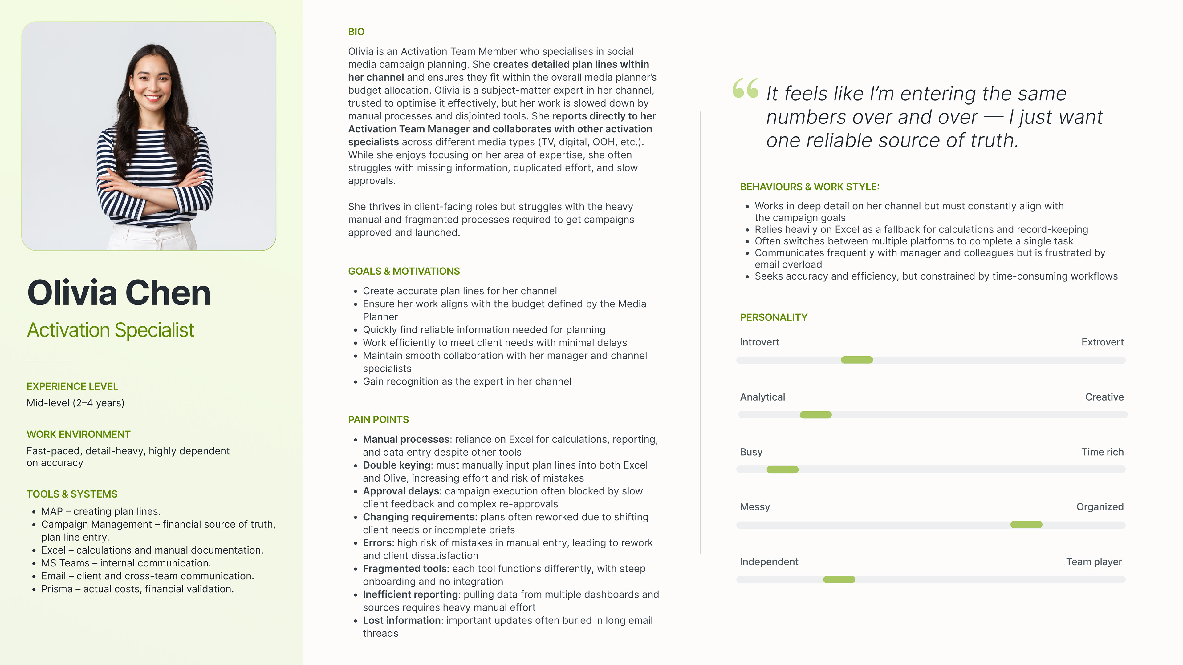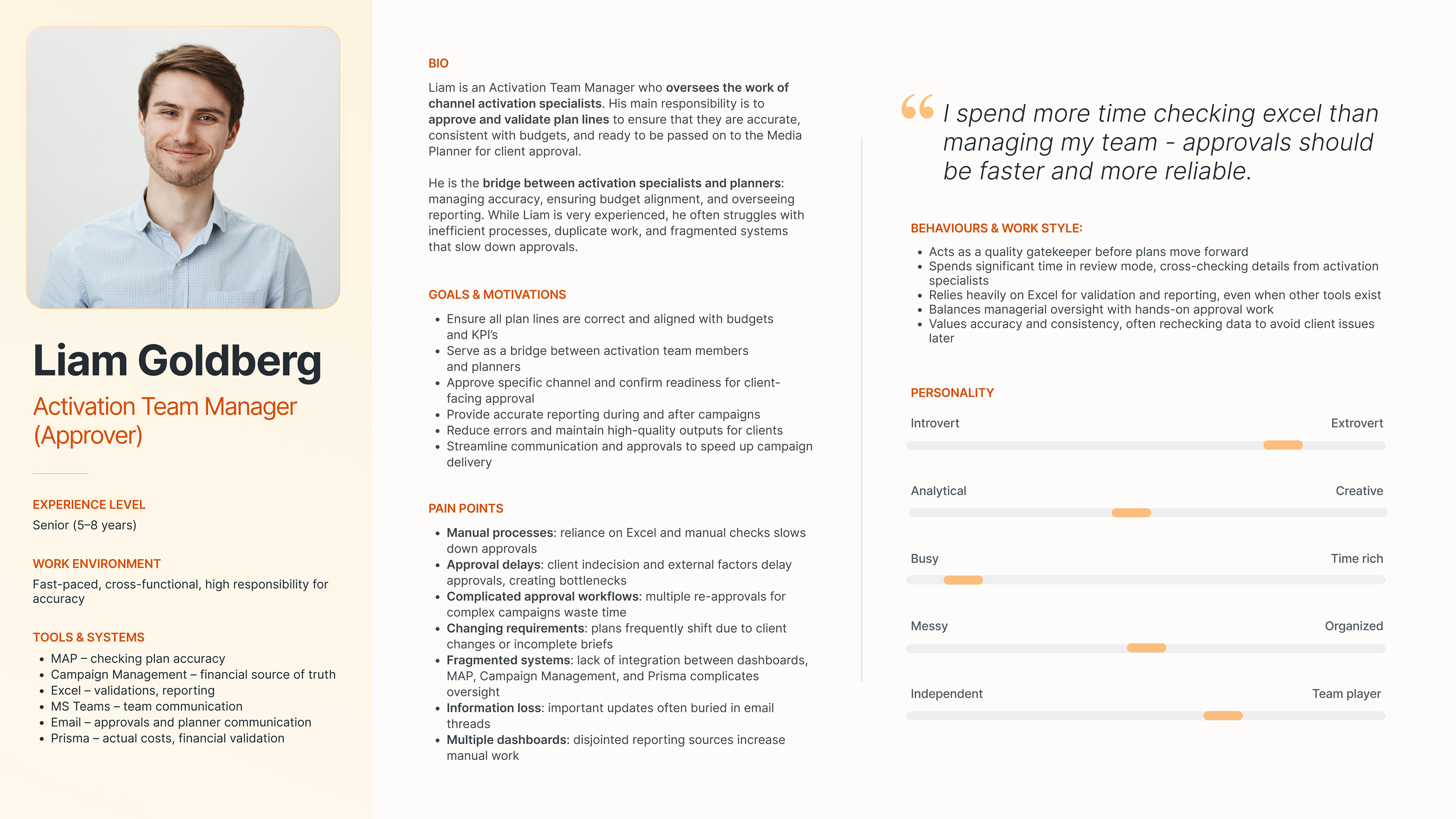 Through our foundational UX research, user interviews and while creating personas, we discovered that media teams spend a huge amount of their workday on manual data entry, using excel, duplicating information from planning spreadsheets into separate financial and activation systems.