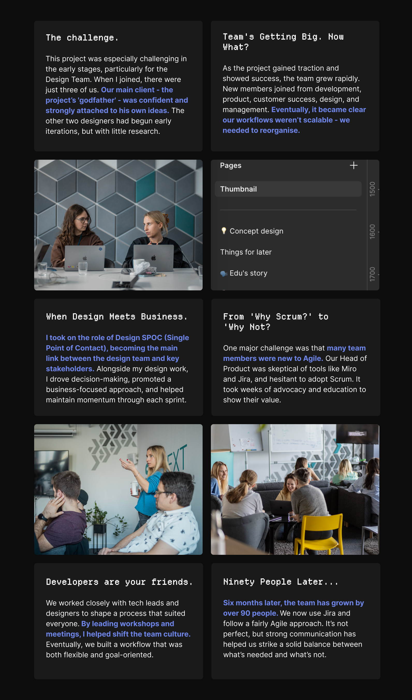 This project started with a small, informal team and grew rapidly as the product gained traction. Along the way, we faced challenges in scaling our processes, aligning cross-functional teams, and introducing Agile ways of working. What follows is a look at how our team adapted.